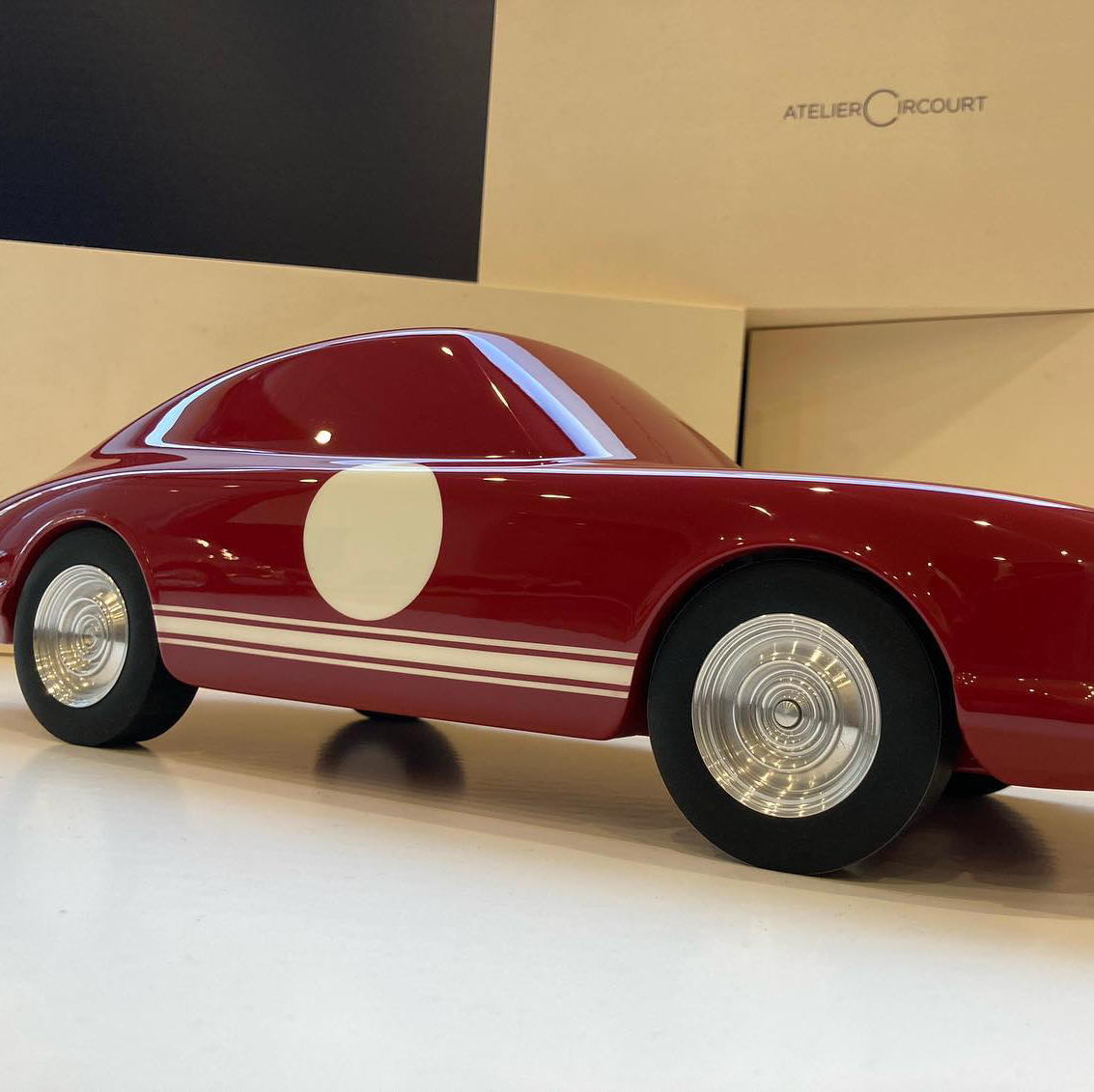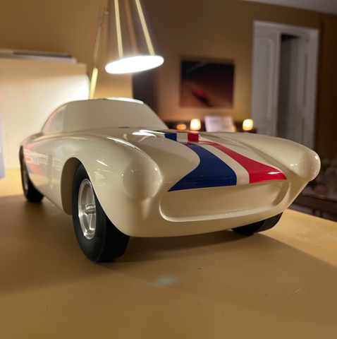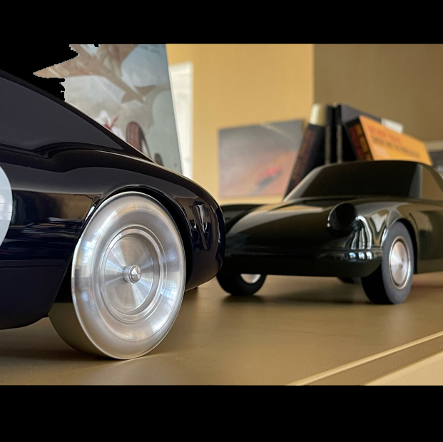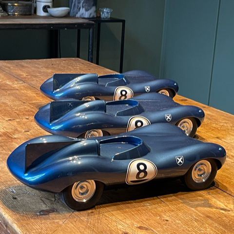 Inspiration Jaguar Type-D "Tailfin". Hêtre massif peint, commande spéciale “Rallye d’Aumale", prix remis aux vainqueur de la course en avril 2022.