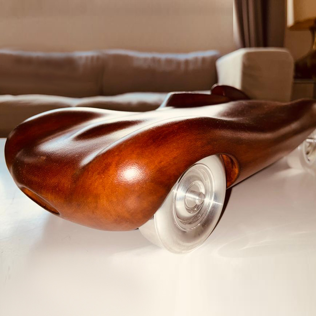 Inspiration Jaguar Type-D. Hêtre massif gainé de cuir pleine fleur Chapal, roues aluminium “Full metal".