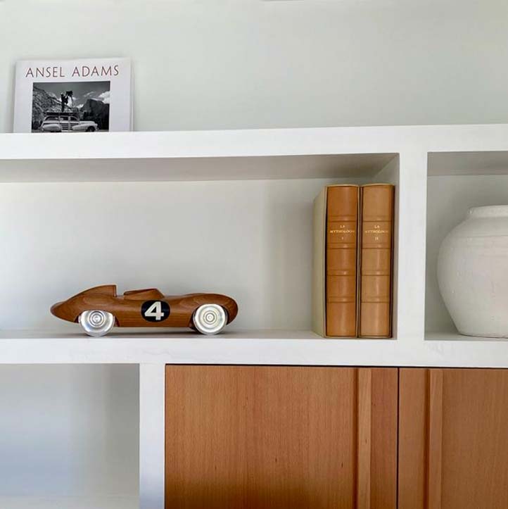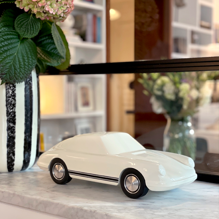 Inspiration Porsche 911. Hêtre massif peint, commande spéciale Old english white & black ; bandes course noires, jantes « Sport ».