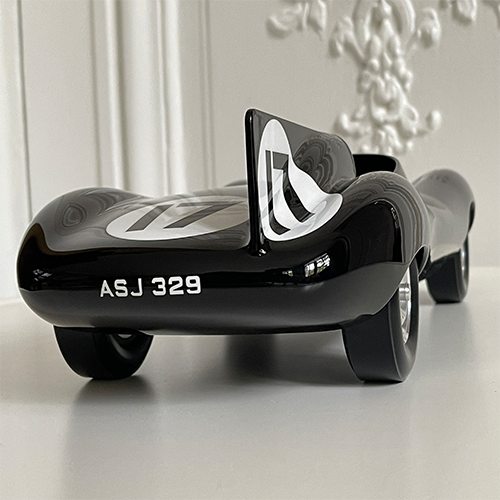Inspiration Jaguar Type-D "Tailfin". Hêtre massif peint “Black", numéros de course et plaque personnalisés, jantes full aluminium et pneus anodisés noir.